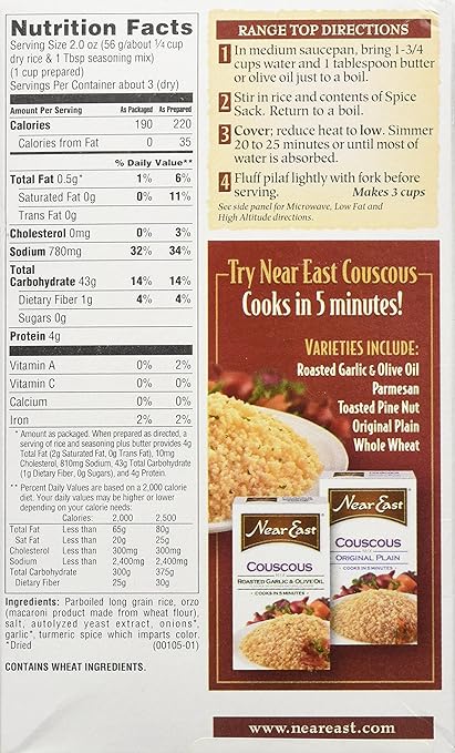 This product may expose you to chemicals including which is are known to the state 1 cup bulgur (cracked wheat). Rice, wheat flour, durum wheat flour, autolyzed yeast extract, salt, red bell pepper*, sugar, onions, parsley*, natural flavor, garlic, soy sauce (soybeans, wheat. Personalized health review for near east rice pilaf mix, original: Roasted vegetable pilaf near east® product: Each of our near east pilafs products come with a separate packet containing a unique blend of herbs, spices and.